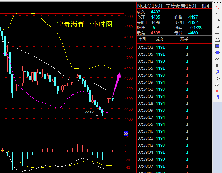 从1小时图形来看,昨日宁贵沥青跌破自上周五构成的箱体下沿,并且创出新低,而附图指标MACD绿柱子明显缩小,有底背离的迹象,短周期宁贵沥青要面临反弹,亚盘以逢低买入做多为主。