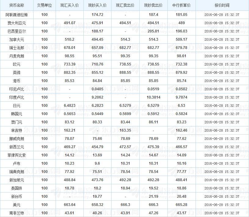 中国银行外汇牌价 2016-06-28(图片来源:东方财富网)