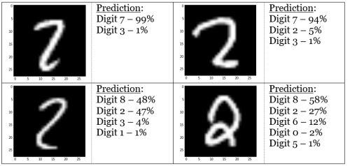 From the table, we can see that when given a handwritten image of either “0” or “1”, the model almost always identifies it correctly. On the other hand, the digit “5” is the trickiest to identify. An advantage of using a contingency table is that it tells us the frequency of mis-identification. When given an image of the digit “2”, it misidentifies it as “7” or “8” in about 8% of the time. Let’s take an in-depth look at some of these misidentified digits.