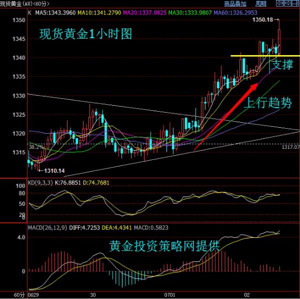 1小时图上看,金价经过上周区间整理后,目前迎来区间突破,企稳1335上方,建议投资者低多思路为主,短期将会上探至1360高位。