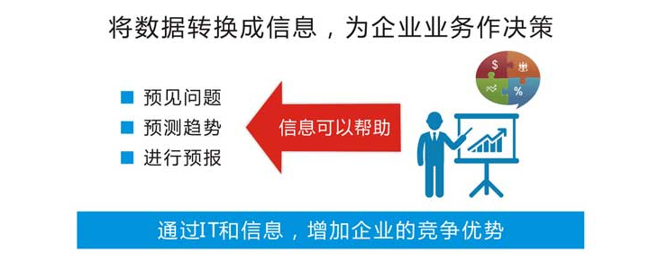 企业应用BI的目标即是期望通过对来自不同的数据源进行统一处理及管理,把数据变成信息、帮助企业把信息变成决策,把决策变成行动,把行动转换成更高效业务操作,从而增加企业的竞争优势。