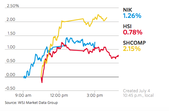 Elsewhere, Japan’s Nikkei Stock Average ended up 0.6%, Australia’s S&P/ASX 200 rose 0.7% and Korea’s Kospi added 0.4%. Hong Kong’s Hang Seng Index ended up 1.3%.