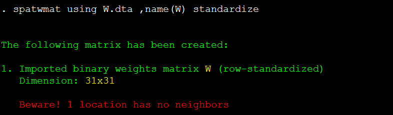 jxapp_19511 发表于 2017-6-4 17:25 楼主,想问一下,在导入矩阵这一步,spatwmat using W.dta,name(W) 命令之后,总是显示type mismatch是怎么 ...