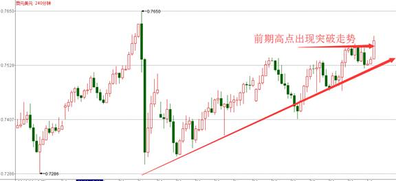 澳元兑美元:澳美元于早间破位上行,0.7580前期高点被短线突破,整体上行趋势明确,建议逢低做多。操作面:0.7440-0.7460间择机做多,目标位0.7630。