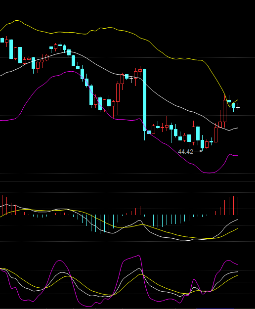 从四小时图来看,布林带开口向下运行,K线价格在布林带中轨附近承压后一路跌穿中轨与下轨,后又受布林带下轨支撑小幅回升,目前在45美元附近震荡交投;MACD指标在零轴下方形成死叉并向下延伸,绿色动能柱放量;KDJ指标三线有聚拢的趋势。
