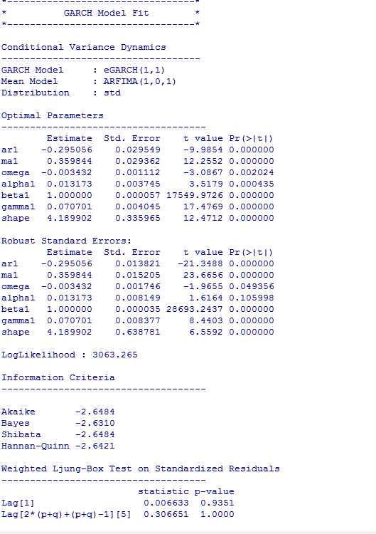 myspec1=ugarchspec(variance.model = list(model = "eGARCH", garchOrder = c(1, 1)),