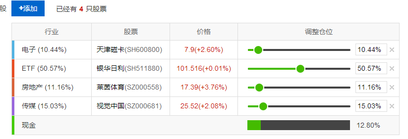 目前一刀下面的账户绝大部分是空仓,但其实有几个激进的账户是有操作的。几个激进的账户,目前基本持仓是3成左右。昨天进的莱茵体育,上午跌近3个点的时候进的天津磁卡,尾盘入的视觉中国,暂时基本都是盈利。