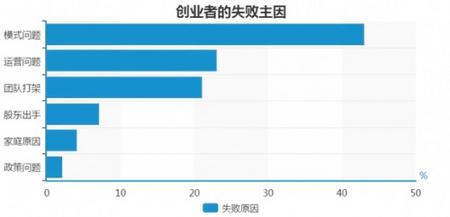 模式问题,占 43 %。各种主打“市梦率”的创业公司,在新经济的大旗下,尝试各种颠覆一切的新模式,从电商到移动互联网,从 O2O 到企业服务。但是随着市场风云变幻,概念或模式往往会迅速由香转臭。随着泡沫的破灭,这些企业会迅速因为融不到钱而倒闭或泯然于人群之中。