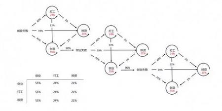 在当前的稳态(用红色数字标出):继续创业的人提升到 55 %,打工的人大幅降低到 24 %,投资的人基本持平在 21 %;