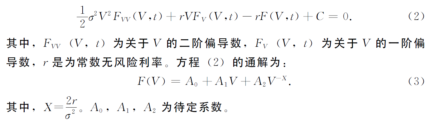 c,用 $F^0=V^a$ 的形式解带入齐次方程 $V^2 F^0_{V V} + X V F^0_V -X F^0 =0$,可以得到特征方程 $(a-1)(a+X)=0$,这个方程是a的二次代数方程,可以求得两个根 $a^1=1$,$a^2=-X$,于是你就可以得到(3)式的后两项(由于是二次微分方程,所以两个待定常数)$F^0=A_1 V +A_2 V^{-X}$。