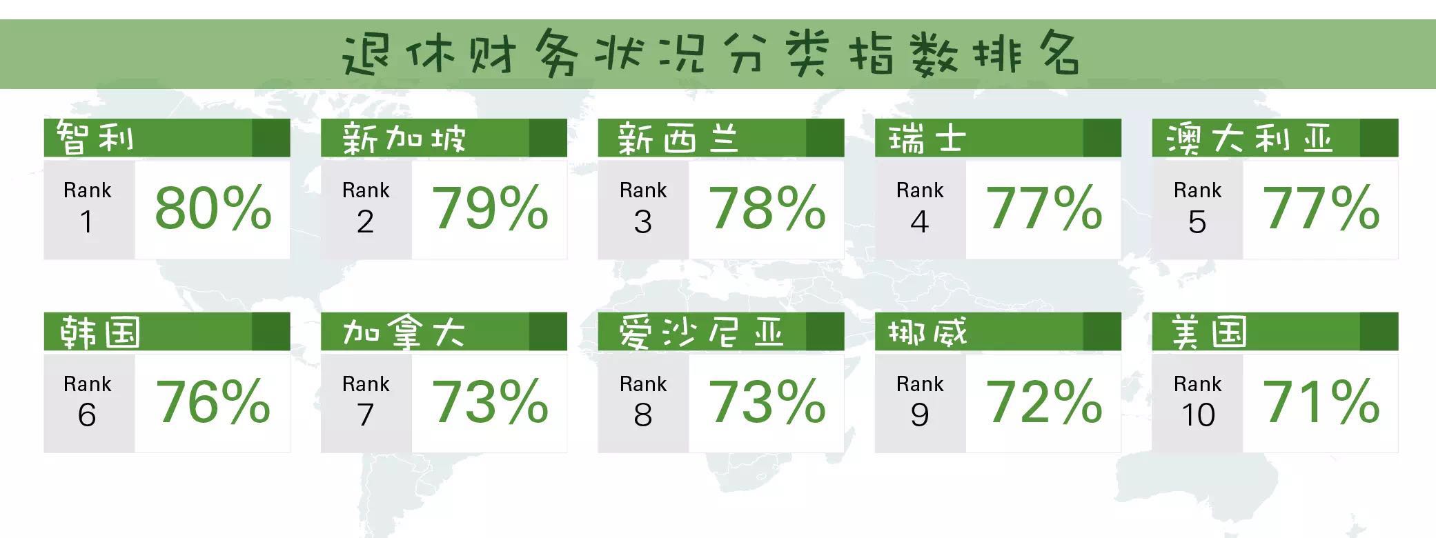 退休指数排名前10的国家(得分在77%或以上)包括:挪威、瑞士、冰岛、新西兰、瑞典、澳大利亚、德国、荷兰、奥地利和加拿大。
