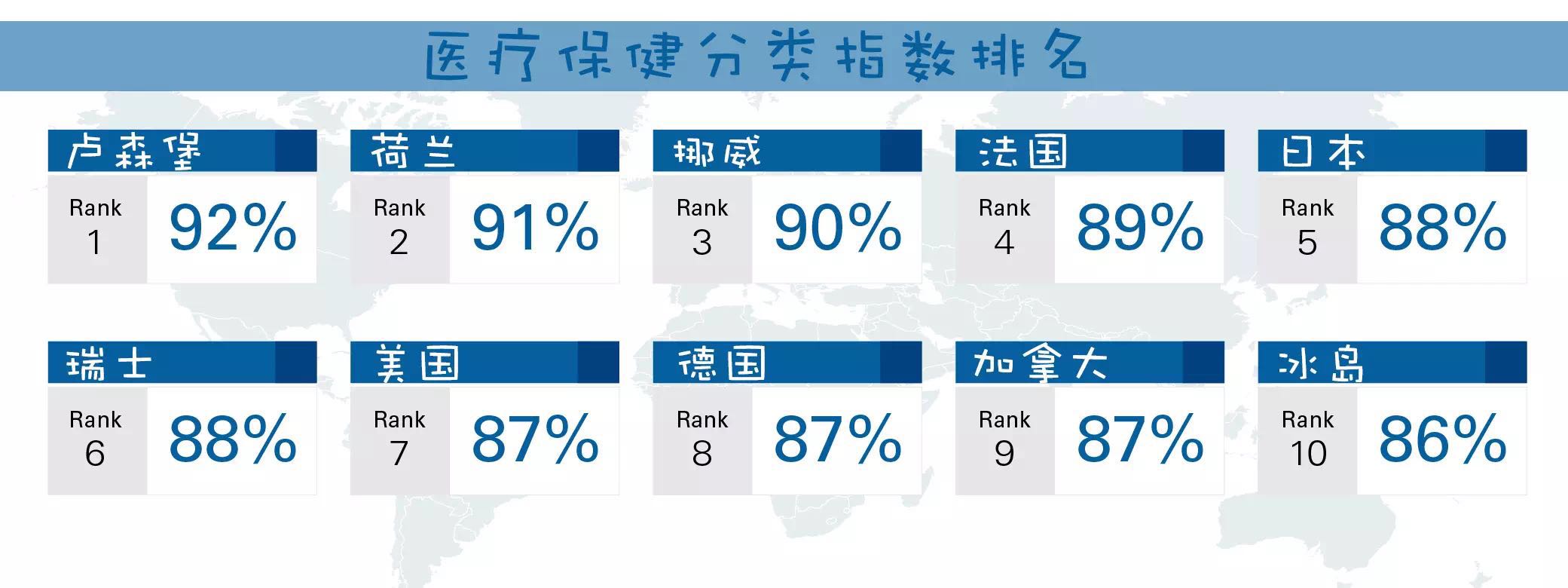 美国在卫生保健分类指数中也表现不错,排名第七,这可能会让不少受困于医疗费用高昂和医保覆盖不完备的美国人感到意外。这一分类指数考察的指标包括人均医疗支出、未参保人员医疗费支出水平和人口平均寿命。报告称,在该指数涵盖的43个国家当中,美国的人均医疗费支出最高,未参保人员的医疗支出排名第六。美国的人均寿命排名第30。