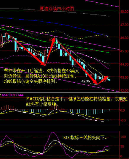 美国WTI原油从四小时走势图来看,布林带在前期开口后又缩拢,且持续受到上方MA10日均线的压制,均线系统仍偏空头顺序排列,但下方触及布林带下轨后录得一波反弹,预计短线将维持震荡。