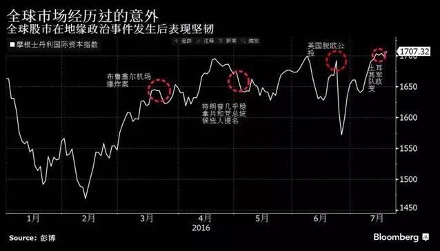 以美国股市为例,近日成分股公司的市盈率在7年来首次突破了20倍。公司利润并没有增长,股票回购和企业并购方面也是风平浪静。但就是在英国退欧、尼斯发生恐怖袭击和土耳其军事政变未遂的背景下,标准普尔500指数已连续三周大幅反弹,收盘创下13个月来新高。