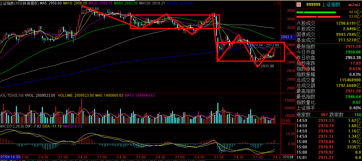 今日指数基本平开,随后的走势基本符合预期,进行小阴小阳线的震荡,盘中也实现了我们所说的至少反抽到2968点的判断。下午一点五十左右,指数开始放量上攻动作,尾盘出现翘尾,截止收盘,上证指数上涨0.61%,创业板指上涨0.67%,纷纷以小阳线报收。