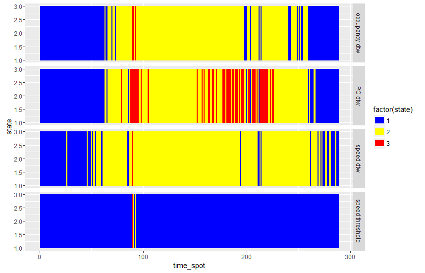 上图为四个观测为离散值的时间序列的比较,每个序列只有3个取值:1,2,3,图中分别用蓝、黄、红表示,从肉眼观察来看,最下面的序列最为平滑,局部波动最小;第二个序列最不平滑,局部波动很剧烈,但是如何用一个定量的指标去描述与这种平滑性呢?