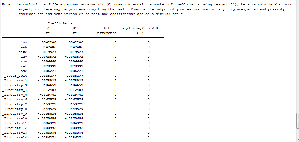 求助!在做豪斯曼检验时显示的结果异常,请问是什么问题?谢谢!!