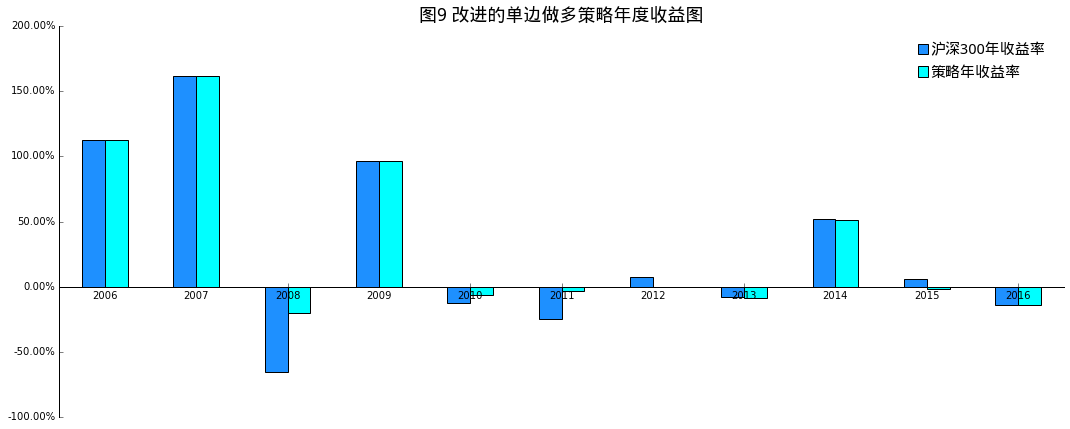 分年度来看,与沪深 300 相比,该策略表除了在牛市中基本上跟住了沪深 300 的收益,同时在 2008 年以及 2011 年的熊市中也有较大的正收益。年度具体收益如下图所示: