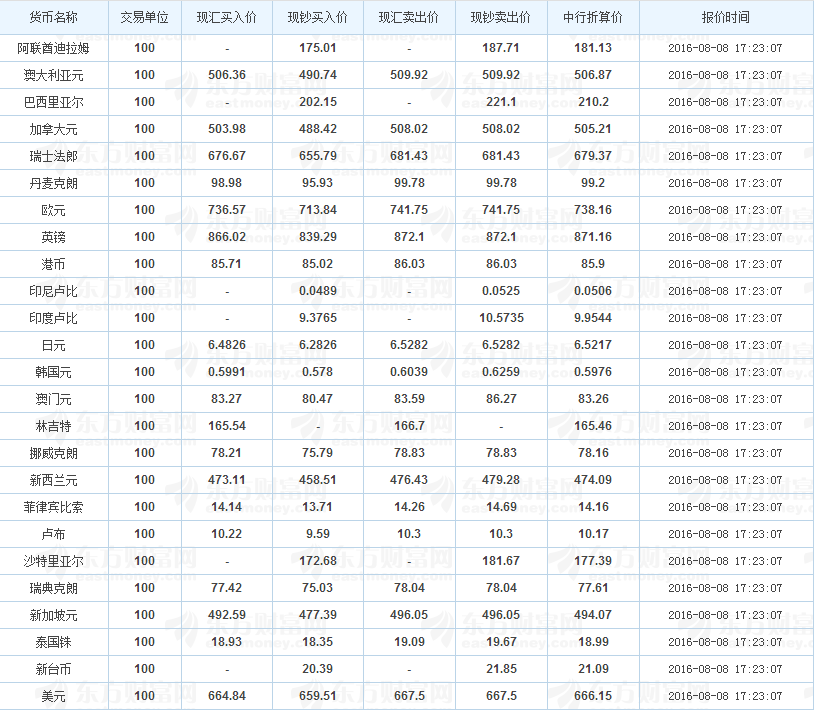中国银行外汇牌价 2016-08-08(图片来源:东方财富网)