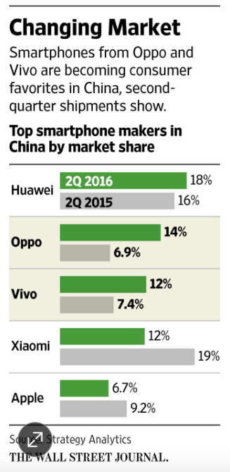As sales of Apple Inc.’s pricey iPhone falter here, both upstart brands are surging in popularity—aided by old-school brick-and-mortar stores and that relentless advertising. Oppo and Vivo are No. 2 and No. 3, respectively, in China’s smartphone market, based on second-quarter shipments to vendors, according to Strategy Analytics. They trail Huawei Technologies Co.