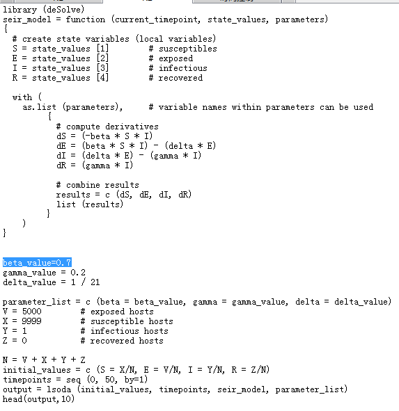 output = lsoda (initial_values, timepoints, seir_model, parameter_list)