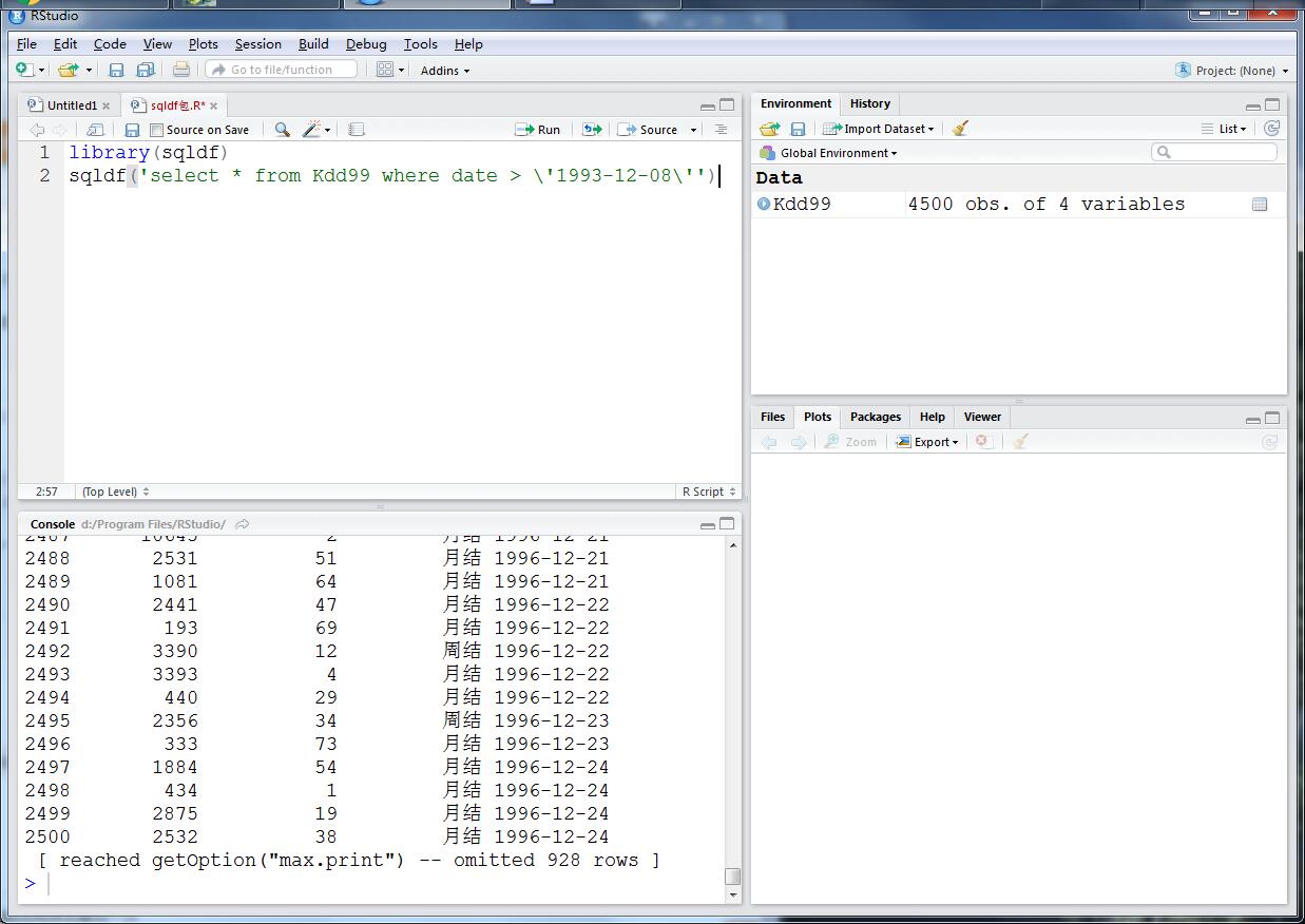 allenlu2008 发表于 2016-8-15 14:02 sqldf('select * from Kdd99 where date > \'1993-12-08\'') 直接把日期字段用引号引起了就可以计算了。