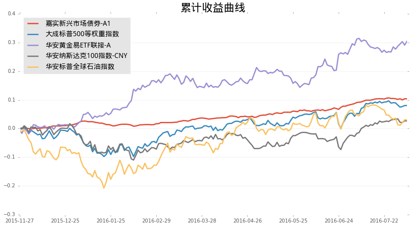 从以上可以看到,如我们所熟知的那样,债券是最稳定的,波动率最低,收益比同时期的股票基金更高;而收益最高的是黄金,波动率是第二高的,并不大;波动率最大的是石油,收益却不是最低的。
