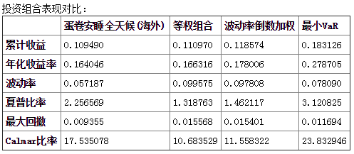 和等权重组合相比,该组合在收益率提升了的同时,波动率下降了,但还是不能和蛋卷组合的小波动率相比