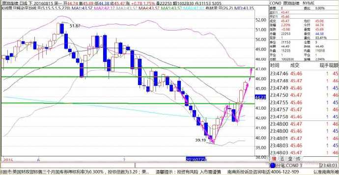 原油晚间不负众望,完全达到我们早盘给出大家的点位,多头也一度延续上周的力度,晚盘最高冲至45.7美金左右。而离日线上方的压力位46.10美金非常接近。从小时图的K线看,目标已经上稳布林线上轨45.5一线的支撑,晚间后市的趋势还会上涨。从周线的第三根上涨阳线来看,本周的上方或许会到47美金上方。所以福晓达,建议大家依旧回调做多为主。现价45.5左右进场多单,止损45一线,目标参考46.1-47美金一线。