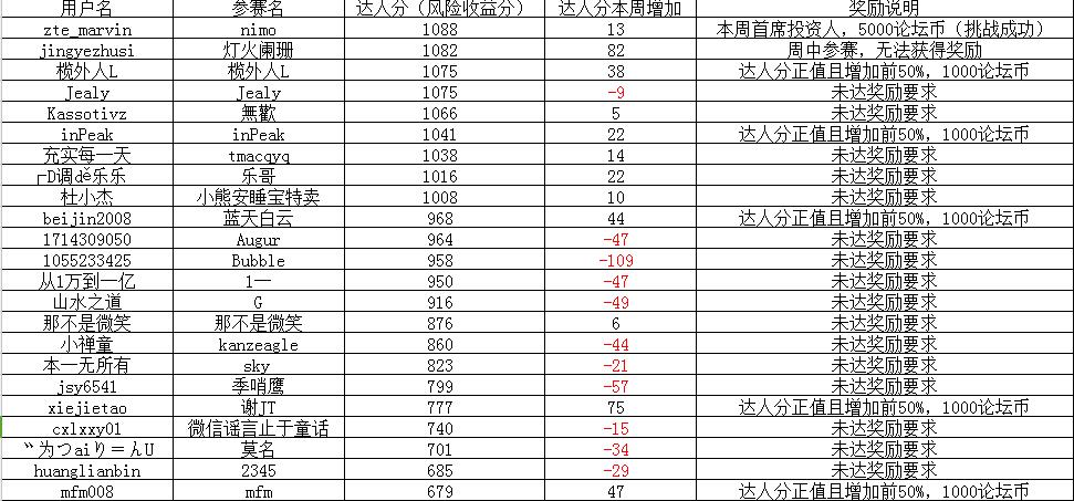 2.每周达人分为正,且增加值前50%者,全部奖励1千论坛币