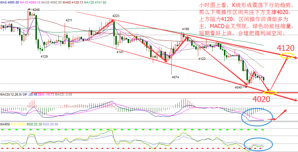白银继续箱体震荡格局,昨日晚间下探4040前期低点,再次反弹,收阴于4059,小时图上看,K线形成震荡下行的趋势,那么操作区间关注下方支撑4020,上方支撑4120,区间操作回调做多为主,MACD金叉预现,绿色动能柱缩量,短期看好上涨,投资朋友合理把握利润空间。