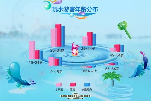 在游客的年龄分布上,25-34岁之间的80、90后游客为主要消费人群。这一年龄层的游客年轻且精力旺盛、喜欢尝试新鲜事物、乐于接受挑战,是绝对的游玩主力。爱玩水是孩子的天性,不少70后、80后的辣爸辣妈带着宝贝一起嗨。