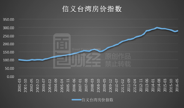 2008年次贷危机爆发之后,台湾房价经历了一波调整,不过很快就恢复上涨。从2009年3月到2014年6月连涨了五年,房价几乎翻倍。不过在2014年中期之后持续下跌,经历了漫长的调整。下图是面包财经(微信公众号ID:mbcaijing)整理的信义台湾房价指数: