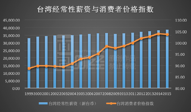 统计数据显示:考虑消费者物价指数之后,2000年台湾经常性实质薪资为37805新台币;2015年则为37588新台币,比15年前还少200多新台币。