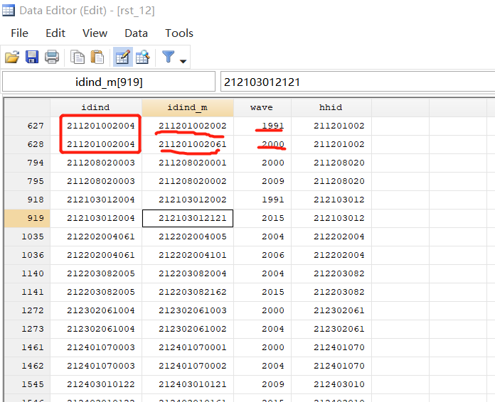 比如在 rst_12.dta中,idind=211201002004的个体 其母亲的id在1991年为211201002002,而母亲id在2000年又为211201002061。但在CHNS的说明性文档中,说的是每个人的id是唯一标志的,不随时间而变。个体可以成立新的家庭,在后续wave中赋予一个新的家庭id,但其父母和配偶的id应该不变才是啊!!!当然一个人可能离婚,但父母应该不变吧???这样的观测值很多 这是为什么呢?求解答