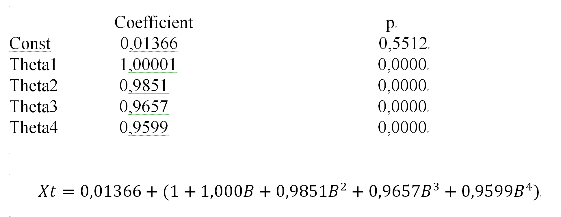 木子1022羽 发表于 2016-9-3 05:11 建了 MA(4)模型,结果如图所示,常数项貌似不显著,这个应该怎么办呢? 另外, 关于Theta值的 ...