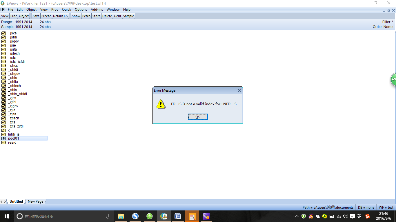 按照论坛上亲们的指示,在pool序列里的poolgenr中输入LnFdi?=Ln(Fdi?),却总是说是无效参数,有好心人知道错在哪里吗?