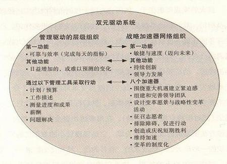 所谓双元驱动系统,讲的是在组织当中,一边是层级组织,另一边是网络组织,层级组织就是我们大家熟悉的大企业的层级——官僚体系。