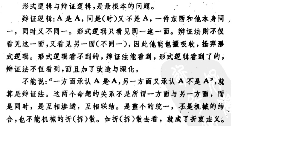 “是就是是,不是就是不是”、“此就是此,彼就是彼”这是反对辩证法的人经常拿来用的“万能公式”,在一定的条件下和一定的范围内,这固然是真理,但是在某些条件下却是束缚事物进一步变化发展的“桎梏”,因而是必须打破或突破的。