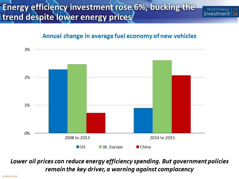 2015年全球能源投资为1.8万亿美元,相照2014年实际下降8%,主要是由于上游油气投资的急剧下降。2015年以前,美国已经连续三年成为能源供应领域最大的投资目的地;2015年,中华人民共和国(以下简称中国)重新登顶,很大程度上是因为其在电力行业创纪录水平的投资以及美国在油气领域投资的下降。中国经济的再平衡及放缓限制了其能源需求,对石油、天然气以及煤的需求增速下降,这对全球的能源投资产生了重大的影响。在欧盟、日本以及美国这样的成熟经济体中,服务业占据主导,使得能源需求与国内生产总值之间的关联被弱化。能效领域的投资巩固了上述结构性的变化,2015年该领域的全球投资金额达到了2200亿美元。尽管当前全球的宏观经济增长以及能源政策的推进都很缓慢,但考虑到上游油气的大部分投资和近40%的电力行业投资目标都是对老化资产的替换,保证供应安全仍然需要大笔的投资。上游油气投资仍是全球能源投资的最大宗,超过总投资的45%。尽管需求明显放缓,但由于可再生能源和电网的扩展,对电力行业的投资仍达到了创纪录的6900亿美元,超过总投资的37%。