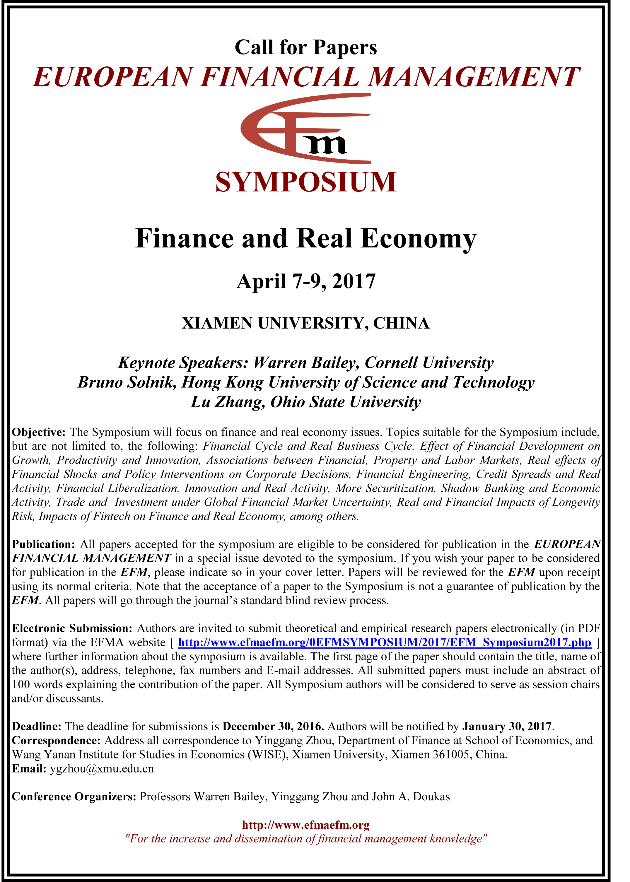 The English edtion of "EFM 2017 Symposium Call for Papers" is as follows.