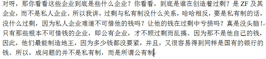 ----------------对呀,那你看看这些企业到底是些什么企业?你看看,到底是谁在创造着过剩?是ZF及其企业,而不是私人企业。所以我讲,过剩与私有制没什么关系,哈哈相反,要是私有制的话,没什么过剩,因为私人企业难道不可惜他的钱吗?让他的钱在过剩中亏损吗?真是没头脑!