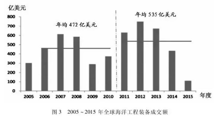 2. 国际海洋工程装备业向亚洲转移的趋势明显。“十一五”期间,全球海洋工程装备成交额年均为472 亿美元,“十二五”期间成交额年均为 535 亿美元。从总体趋势看,全球海洋工程装备成交额呈增长态势(见图 3) 。随着世界造船中心向亚洲的转移,世界海洋工程装备制造业的中心也逐渐向亚洲转移。由于我国在基础建设、劳动力成本等方面的明显优势,国际海洋工程装备制造业开始呈现从“欧美—日韩—中国”的转移势态。目前,我国已在多地建设海洋工程基地,拥有较为完备的海洋工程装备配套产业,海洋工程装备企业每年承接大量海洋工程订单,研发实力不断提升,一批优秀的海洋工程企业已成长起来,并在部分高技术含量的装备生产上取得突破性进展。目前,我国已具备承接国际海洋工程装备业产业转移的条件与基础,海洋工程装备制造业也将迎来新的发展机遇。