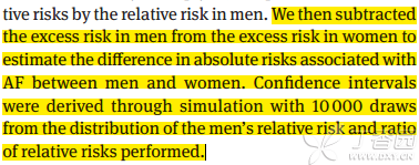 注意这句话Confidence intervals were derived through simulation with 10 000 draws from the distribution of the men’s relative risk and ratio of relative risks performed.