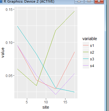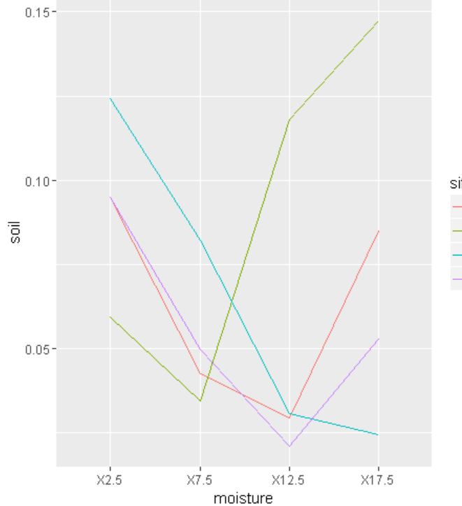 ggplotB2, aes(soil, moisture, group = site, colour = site))+geom_line()