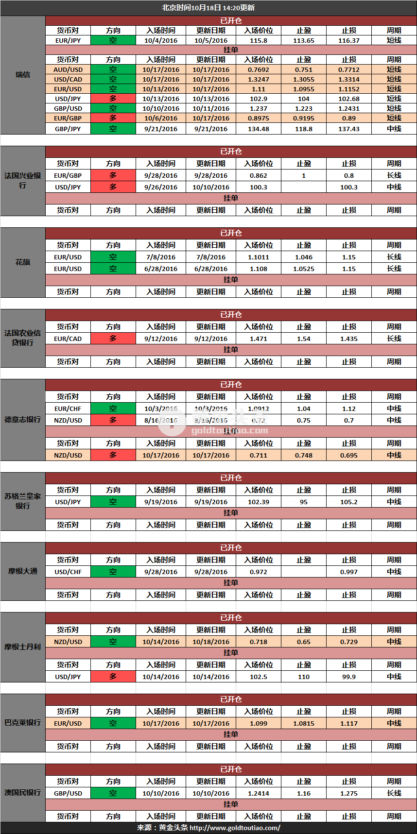 今天14:20更新:摩根士丹利于0.718做空纽元,目标点位0.65,止损价0.729。巴克莱银行于1.099做空欧元,目标点位1.0815,止损价1.117。
