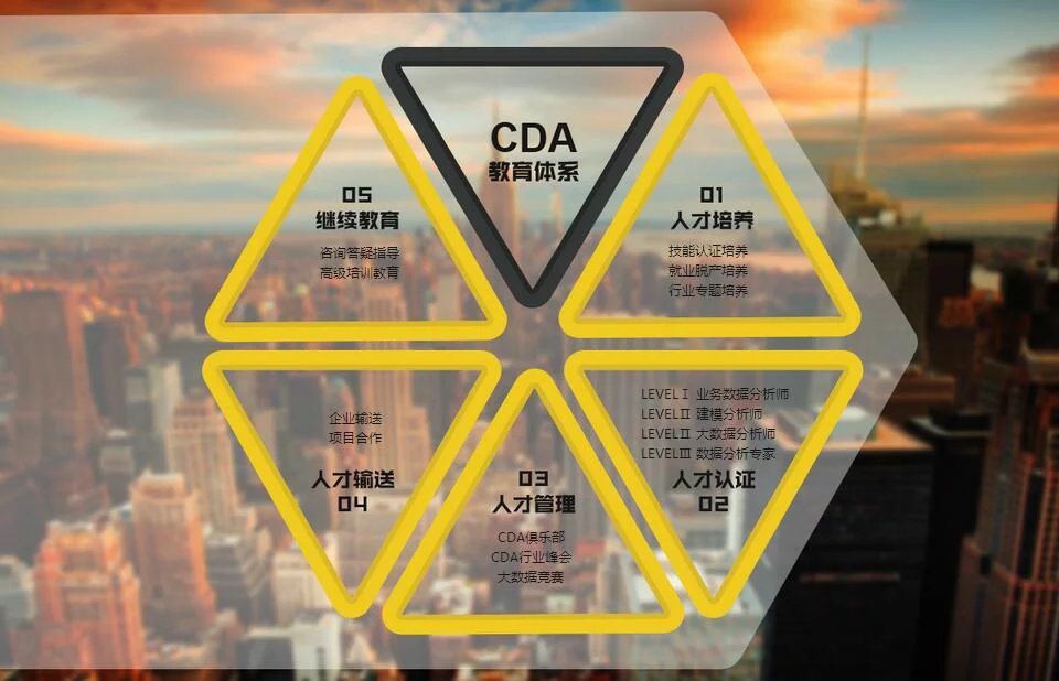 “CDA数据分析师”品牌立足于数据分析领域教育事业,旨在汇聚国际领先数据分析技术,研发数据分析师人才教育体系,提供人才的培养、人才的认证、人才的管理以及人才的输送,进一步提升数据分析师的职业素养与能力水平,促进数据分析行业的高质量持续快速发展。