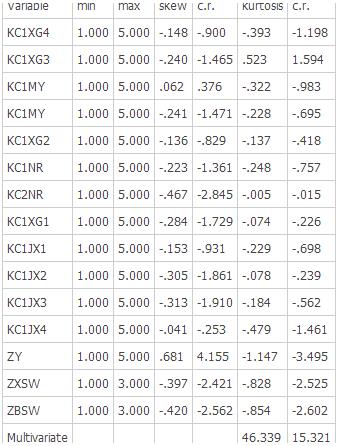 样本350,每一个变量都不是正太分布,但是skew和kurtosis都在可以接受的2和7的范围内,但是Multivariate 不满足多元正态性。