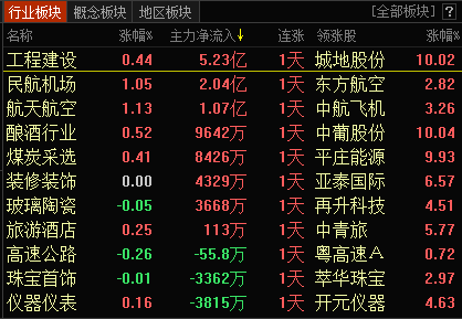板块方面今日资金流入最多的板块依次为工程建设,民航机场,航天航空,酿酒行业,煤炭采选,装修装饰。但我们也能看到,今天流入最多的工程建设板块的资金量只有5.23亿,较昨天出现了较大幅度的萎缩。这里面工程建设本周已经是第三次位居板块资金流入量的第一位,后期值得广大投资者重点的关注。