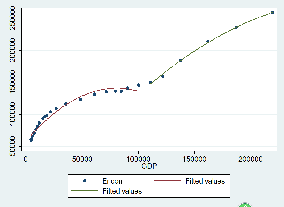 twoway (scatter encon gdp)(qfit encon gdp if dummy==0)(qfit encon gdpif dummy==1)
